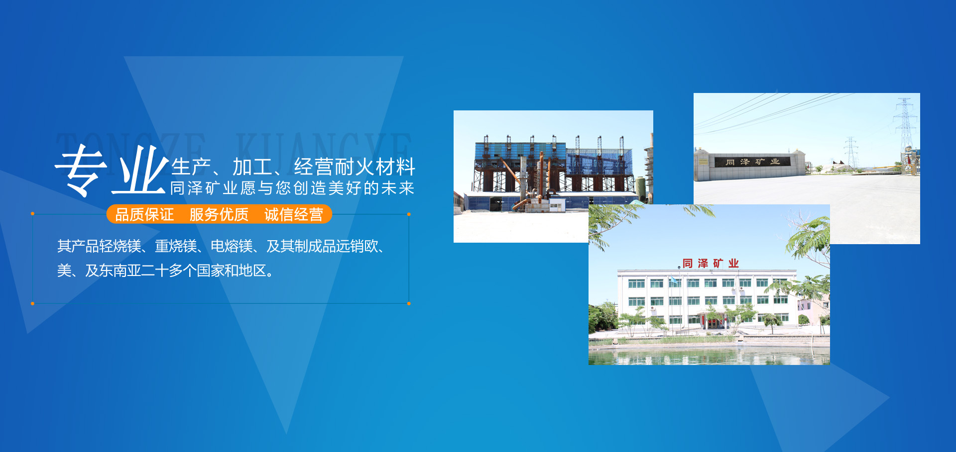 大石橋市同澤礦業(yè)有限公司,是以生產(chǎn)、加工、經(jīng)營各種耐火材料為主的綜合性經(jīng)濟(jì)實(shí)體。其產(chǎn)品輕燒鎂、重?zé)V、電熔鎂、及其制成品遠(yuǎn)銷歐、美、及東南亞二十多個(gè)國家和地區(qū)。